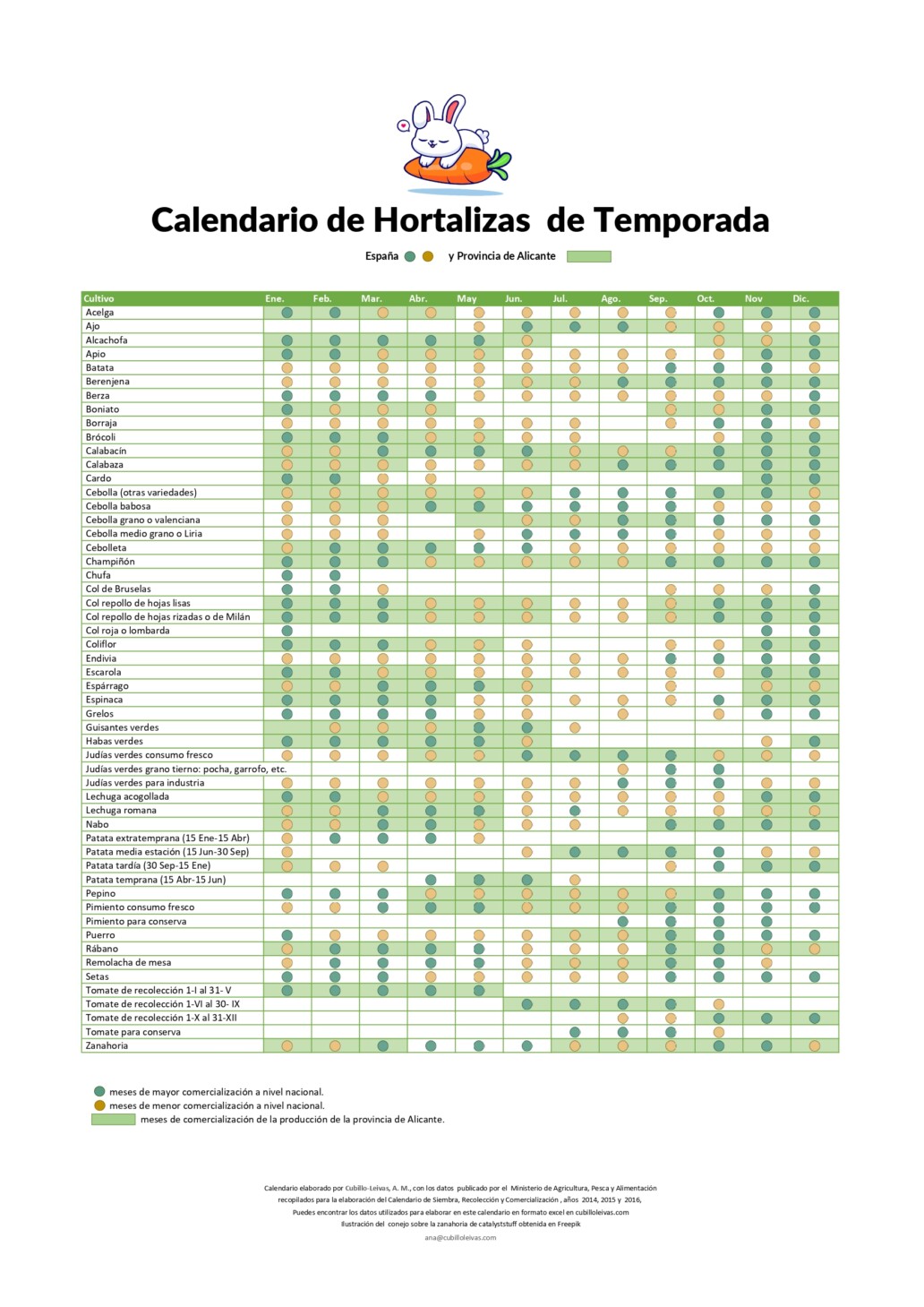 Para los que vivimos en la provincia de Alicante y queremos un calendario de frutas y verduras de temporada con el que saciar nuestra curiosidad y mitigar nuestra ignorancia agraria, he elaborado estas dos opciones: una para frutas y otra para hortalizas. En ambos calendarios aparece la temporada de comercialización nacional y la de los productos cultivados en la provincia de Alicante.